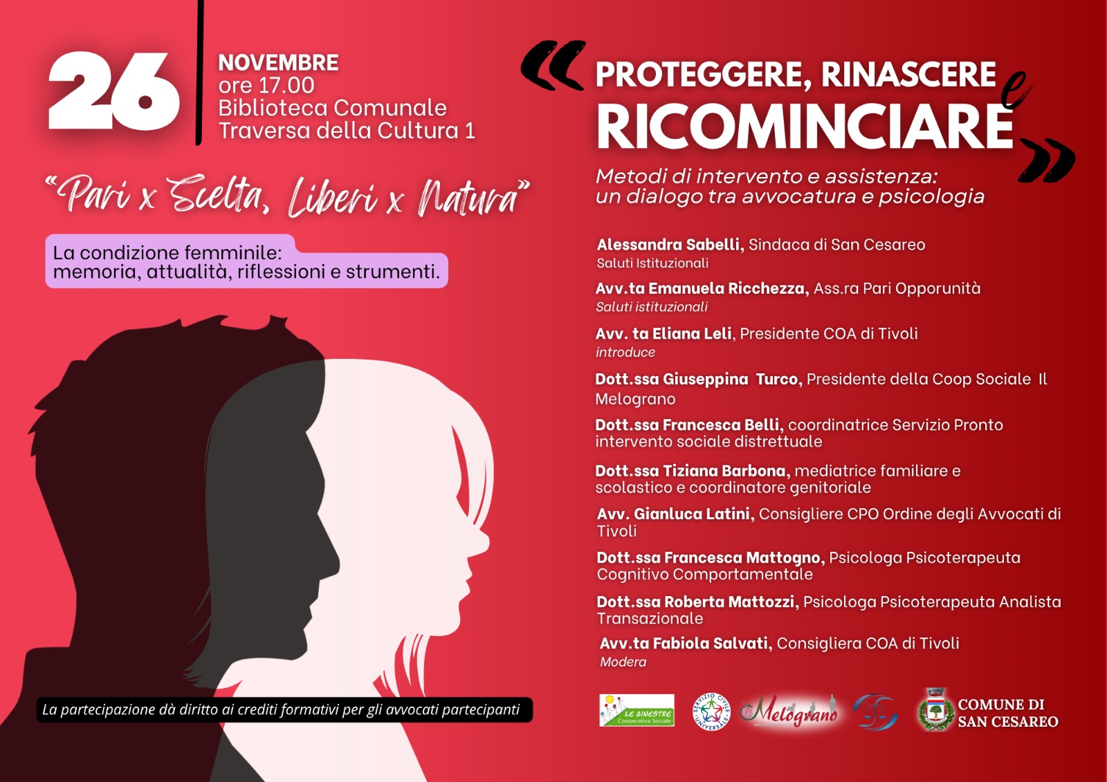 Si comunica che il giorno 26 novembre 2025, dalle ore 17.00 alle ore 19.00, presso la Biblioteca Comunale del Comune di San Cesareo, in Via Traversa della Cultura n. 1 a San Cesareo, si terrà l’incontro formativo organizzato in collaborazione con il Comune di San Cesareo, dal titolo: Pari per scelta, Liberi per natura. PROTEGGERE, RINASCERE, RICOMINCIARE