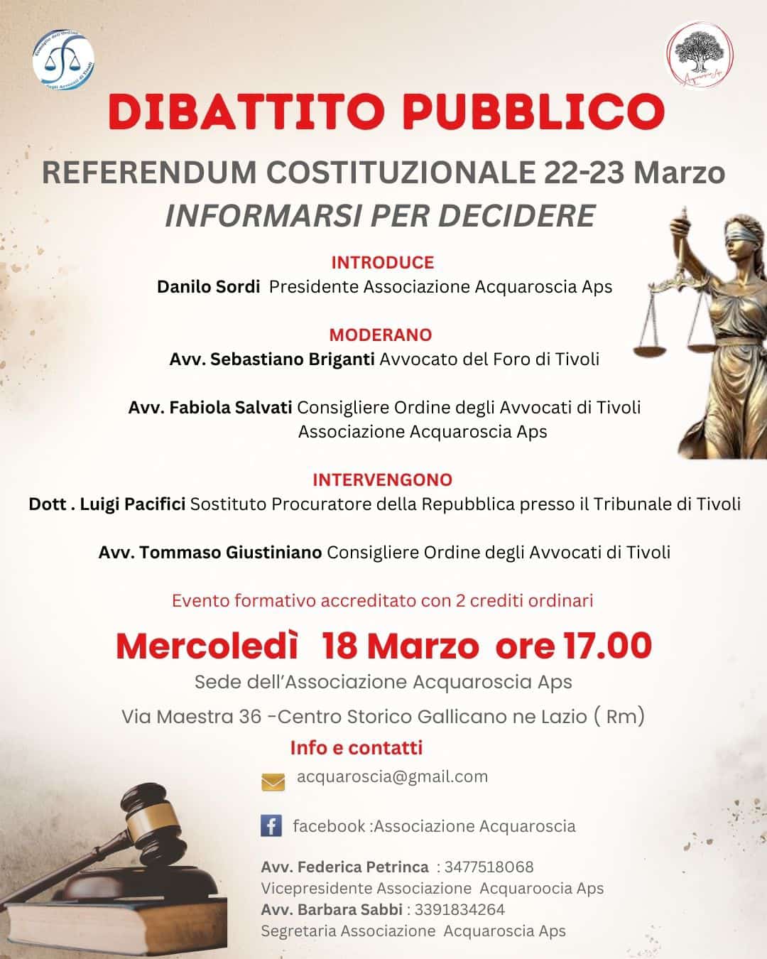 ll Consiglio dell’Ordine degli Avvocati di Tivoli ha patrocinato incontro sul Referendum costituzionale del 22 e 23 marzo 2026, organizzato da APS Acquaroscia.