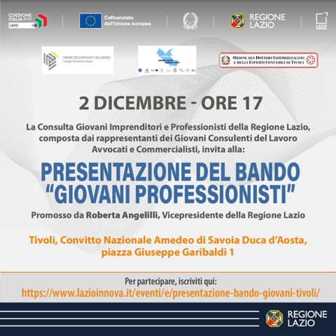 Si comunica che il giorno 2 dicembre 2025, dalle ore 17:00 presso l’aula Magna del Convitto Nazionale Amedeo di Savoia Duca D’Aosta si terrà l’incontro organizzato con il patrocinio dell’Unione degli Ordini Forensi del Lazio per la presentazione del BANDO GIOVANI PROFESSIONISTI promosso dalla Regione Lazio.